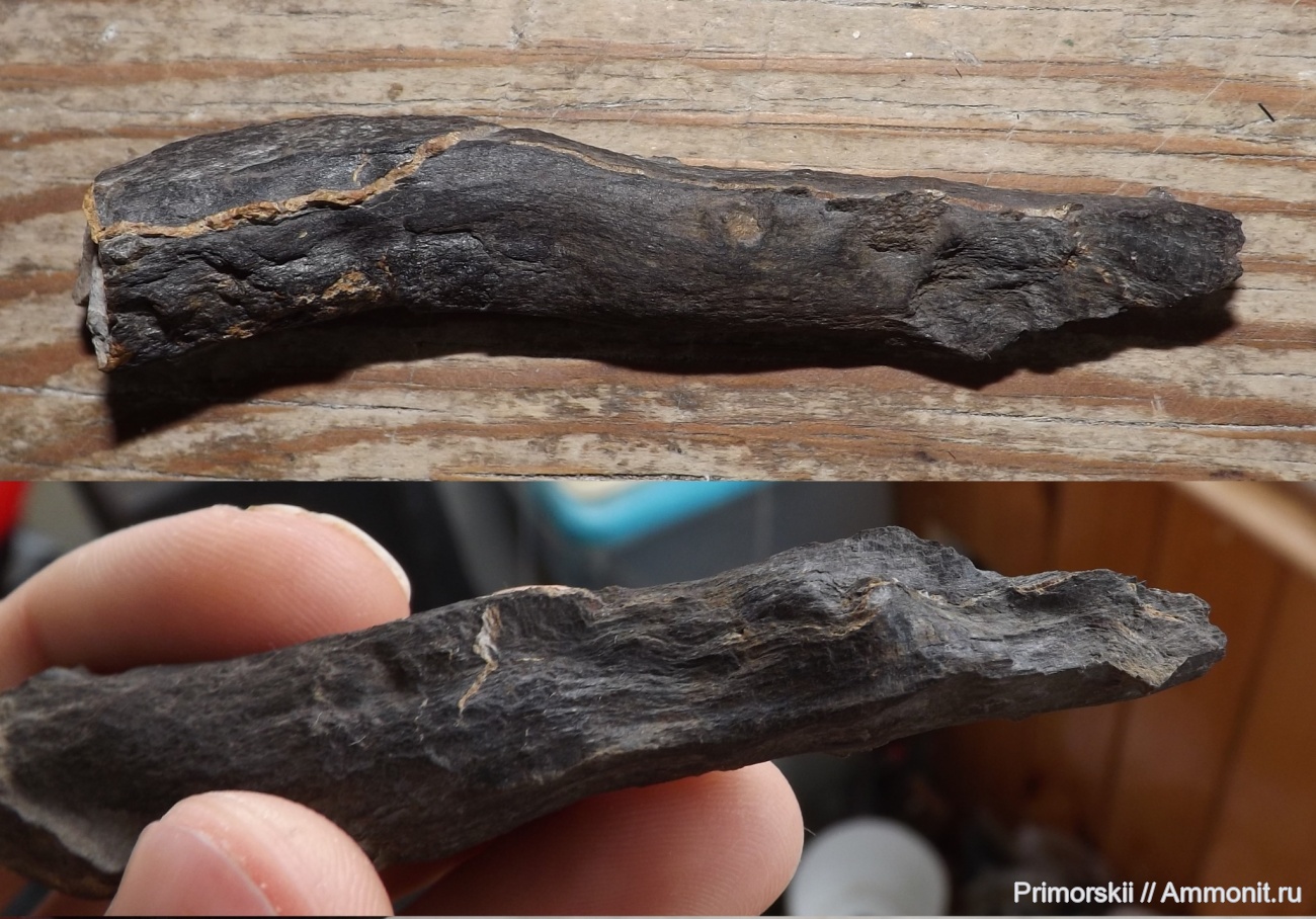 Веточка окаменелого дерева. Откололась при раскалывании аммонитовой конкреции , где и находилась. Продолжение осталось в породе. Вклеивать обратно не стал.