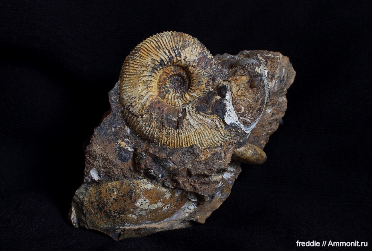 Небольшой Toricellites curticornutus (Buckman) в конкреции, "нашпигованной" двустворками, белемнитами и аммонитами Proplanulites.