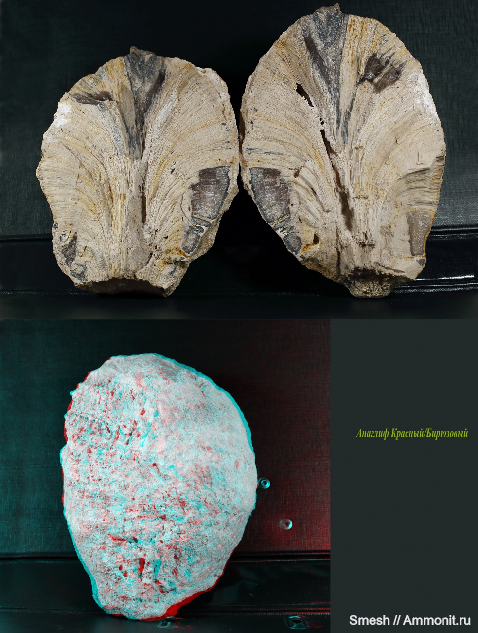 По большей части мы встречаем хететес в виде неброских кусочков, корочек, наростов. Эта губка была довольно "агрессивна" и пыталась "обрасти" всё, что можно. Но когда хететес вырастал на свободном открытом месте, он выглядел строго, достойно и... просто красиво. Именно такой "свободнорастущий" хететес нашёл уважаемый YrYashunsky и подарил мне прямо на месте. Мне осталось только сделать удар молотком и... Великолепный красавец хететес о двух половинках предстаёт на ваш суд. На верхней части фото вы видите эти самые две половинки. Тёмные участки - окремнелые. Внизу - стерефотография образца. В таком виде он был найден. Не поленитесь достать "цветные очки", плоская невнятная фотография чудом преобразится в объёмную.