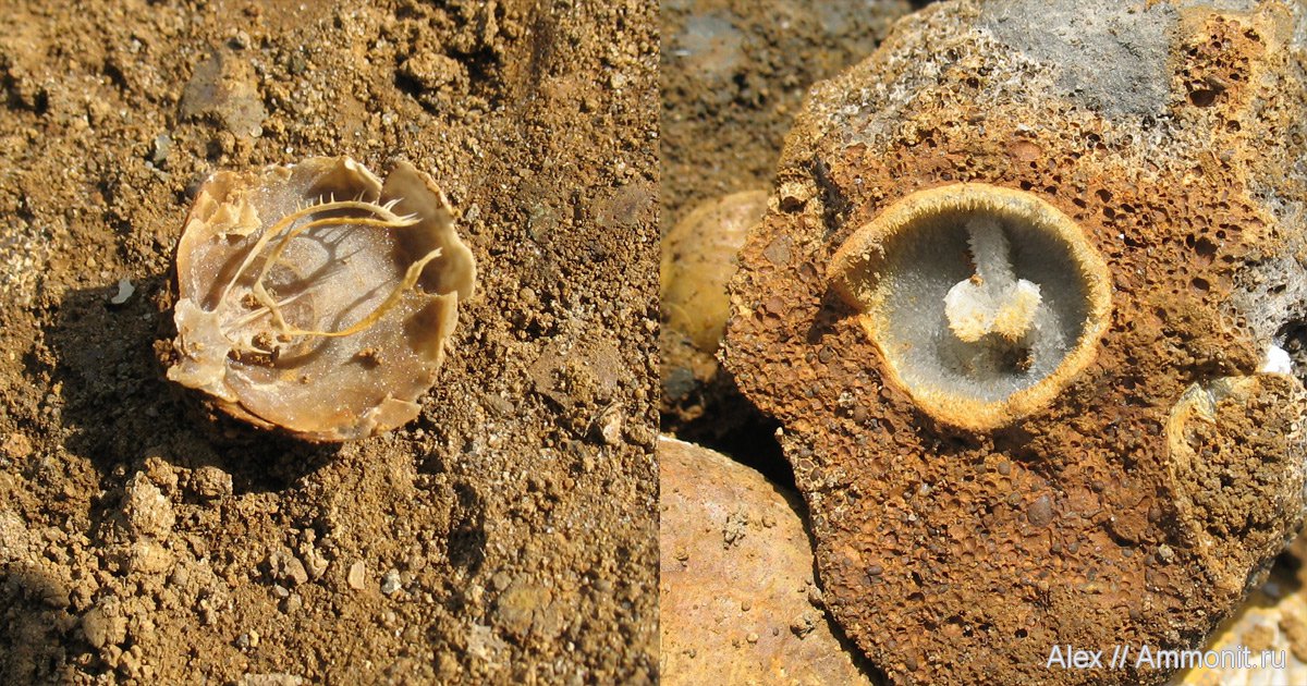 Ручной аппарат брахиопод из Никитино. В Никитино раковины юрских брахиопод сохраняются очень хорошо. Некоторые из них полностью замещаются кальцитом и их полости зарастают кристаллами, а некоторые, как образцы на этих фотографиях, сохраняются практически в прижизненном виде. Размер раковин около сантиметра.