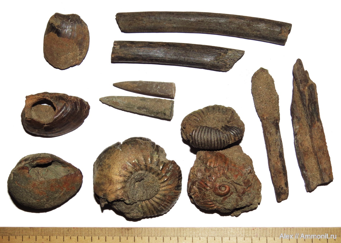 Все окаменелости на фото относятся к зоне Cadoceras elatmae нижнего келловея. Это ядра двустворок (слева), аммониты Cadoceras elatmae (в центре внизу), фрагменты окатанной древесины (справа), два ребра морских рептилий (вверху) и два неполных ростра белемнитов (по центру). Все окаменелости кроме белемнитов полностью замещены пиритом (который, к сожалению, быстро портится). Сохранность аммонитов в этих слоях очень странная - они раздавлены еще до пиритизации. Двустворки там не менее удивительные - почти все ядра с крупными дырками (скорее всего посмертными, видимо они не полностью пиритизировались).