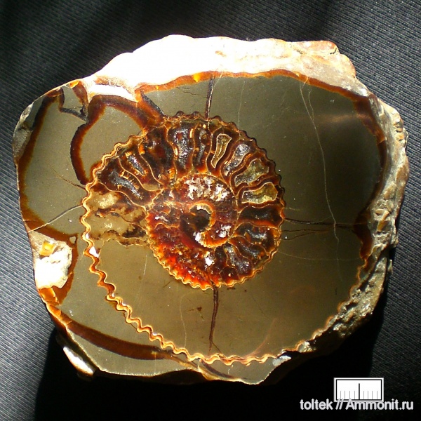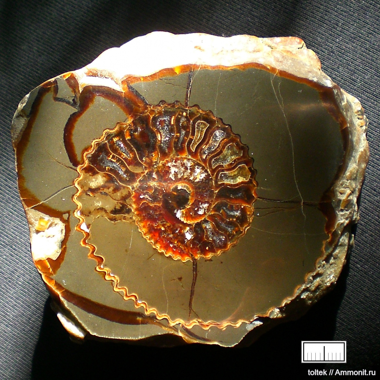 Конкреция, в которой находится аммонит, похожа на септарию - с заполнением трещин кальцитом. Очень красивый образец! | ||||||