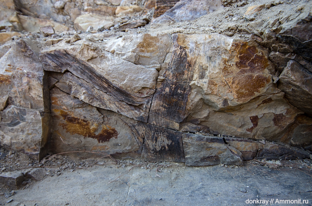 Отпечаток рахиса листа с ответвлением, предположительно Neuropterisа на вертикальной стенке карбонового обнажения. Размер отпечатка по вертикали - 30см.
