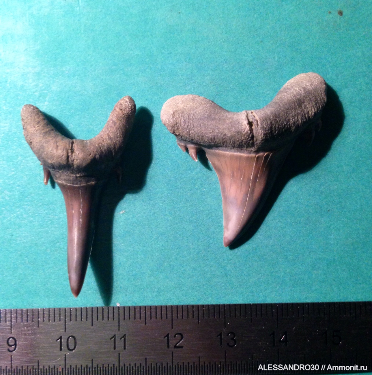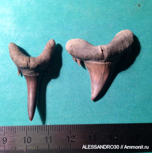 Правый J. cf. trigonalis, левый скорее всего Odontaspis winkleri вот ссылка на их зубы http://www.sheppeyfossils.com/pages/odontaspis.htm | ||||||
