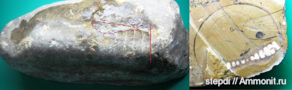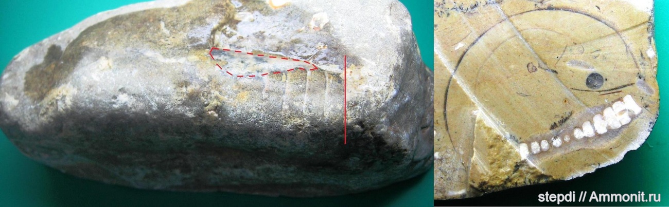Предположительно фрагмокон прямораковинной наутилоидеи (эндоцераса?). Найден в песчаном карьере "Радошковичи" (Минская область, Беларусь). Длина фрагмокона около 100 мм, максимальный диаметр поперечного сечения около 30 мм. Круглая форма поперечного сечения видна в разрезе, представленном на правой части фото и сделанном вдоль вертикальной красной линии. В разрез также попала морская лилия. В области, выделенной штриховой красной линией, сохранились замещенные кальцитом остатки наружной части фрагмокона, дающей круг в поперечном сечении. На остальных участках внешней поверхности образца наружная часть фрагмокона "сошлифована" при перемещении камня ледником, в результате чего вскрылись параллельные межкамерные перегородки. В результате частичной "сошлифовки" наружной части фрагмокона в поперечном сечении круг получился неполным.