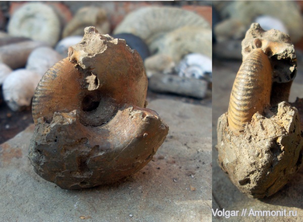 Дидактически интересный образец Rondiceras-а. Наглядно прослеживается изменение формы раковины и постепенное сглаживание ребер при росте аммонита.