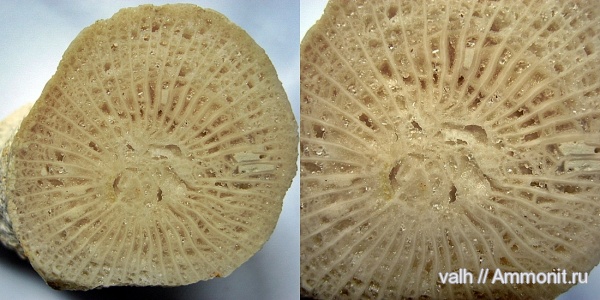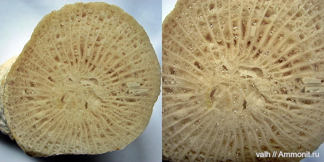 Чистый B.pseudoconicum,учитывая размер образца 30мм в диаметре и продольный размер около 55мм.Основное отличие от B.conicum,септы второго порядка не доходят до внутреннего края зоны диссепиментов(в основном количестве).У неизменённой стенки кораллита(верхняя часть снимка)септы первого порядка истончаются и сливаются с горизонтальными перегородками,образуя сплошную внешнюю зону диссепиментов.