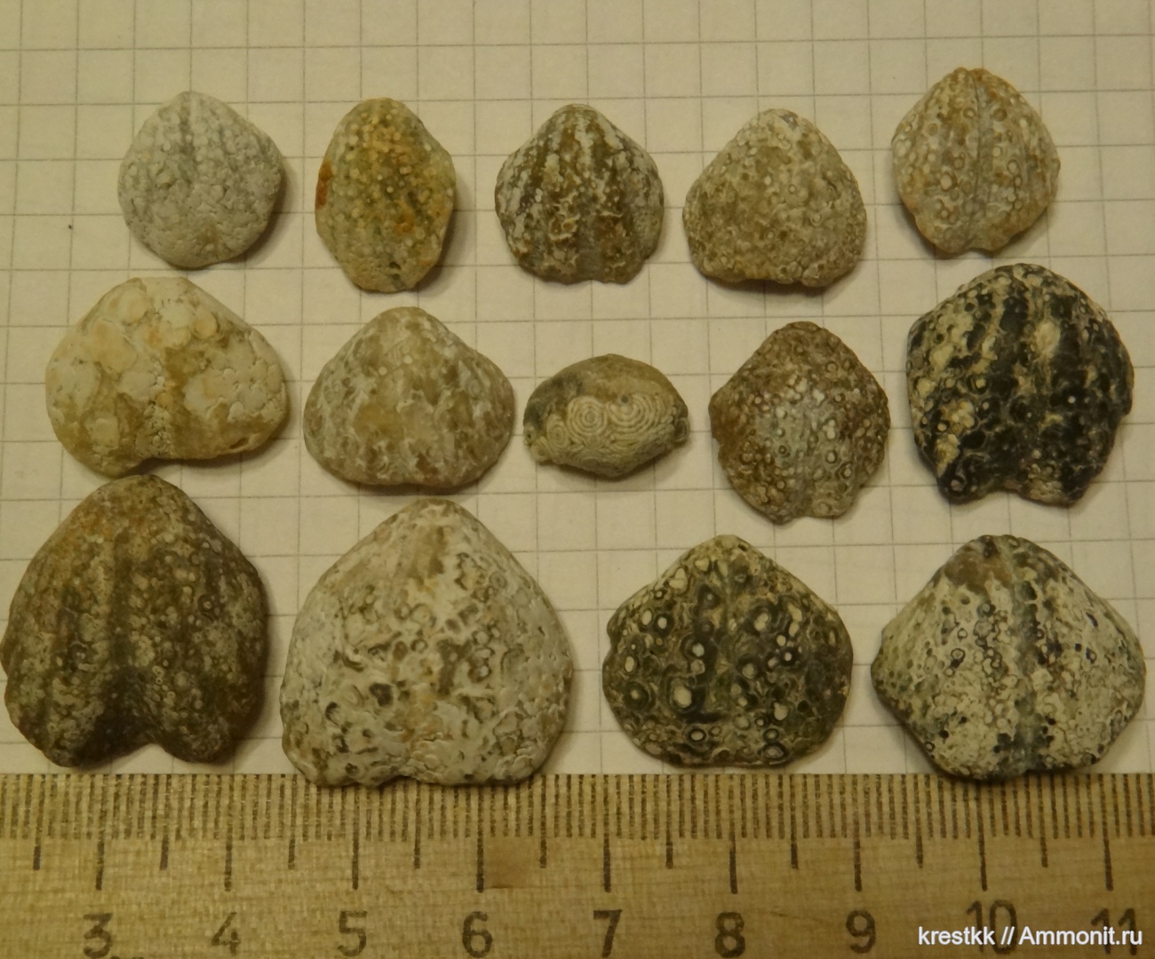 Очень хорошая подборка изолированных брюшных створочек спирифереллин рода Arcullina.