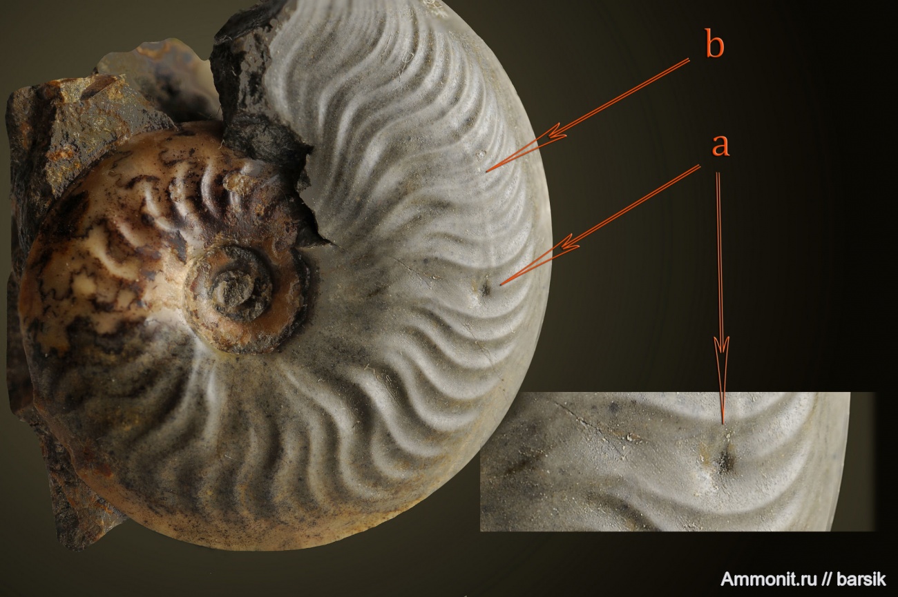 Хорошо видно место укуса (a) и скорее всего это был именно укус раковины у самого устья. Вместе с куском раковины. хищник сильно повредил мантию, которая не успела втянуться вглубь камеры за аптихи. Аммонит остался жив и строил свою раковину уже со шрамом (b). К концу жизни микроконх выздоровел и повреждение постепенно сошло на нет.