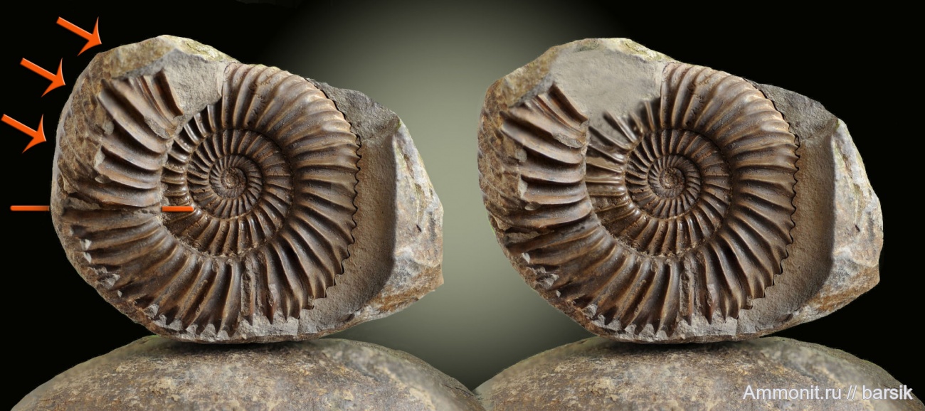 Слева – деформированный слепок юрской паркинсонии. Часть жилой камеры лопнула (по линиям) и потом эту отделившуюся часть буквально нахлобучило на внутренний оборот. Рисунок разворачивающейся спирали сразу же нарушился. Скорее всего, порода, заполнившая жилую камеру оказалась не такой плотной и прочной, как порода конкреции и при движении пластов, фрагмент жилой камеры по стрелкам сместился, и внутренний оборот раковины оказался глубоко погружен во внешний.