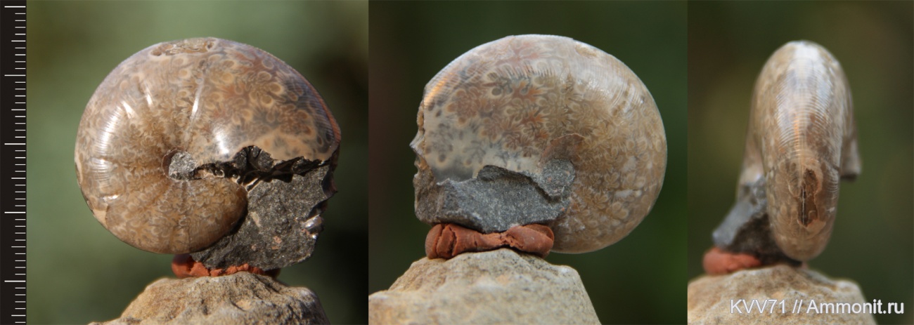 Я где то читал, что раковина аммонита состоит из нескольких слоев. Здесь мы наблюдаем 3 слоя раковины - внешний грубый слой - он здесь почти не виден. Наблюдается на центральном фото в районе пупка. Второй очень красивый прозрачный слой, на котором сохранилась структура раковины от внешнего слоя с пережимами и ребрами, через который мы видим лопастные линии. Ну и третий слой - в котором находятся сами лопастные линии, виден не значительно на сколе второго слоя в районе вентра на левом и правом виде.