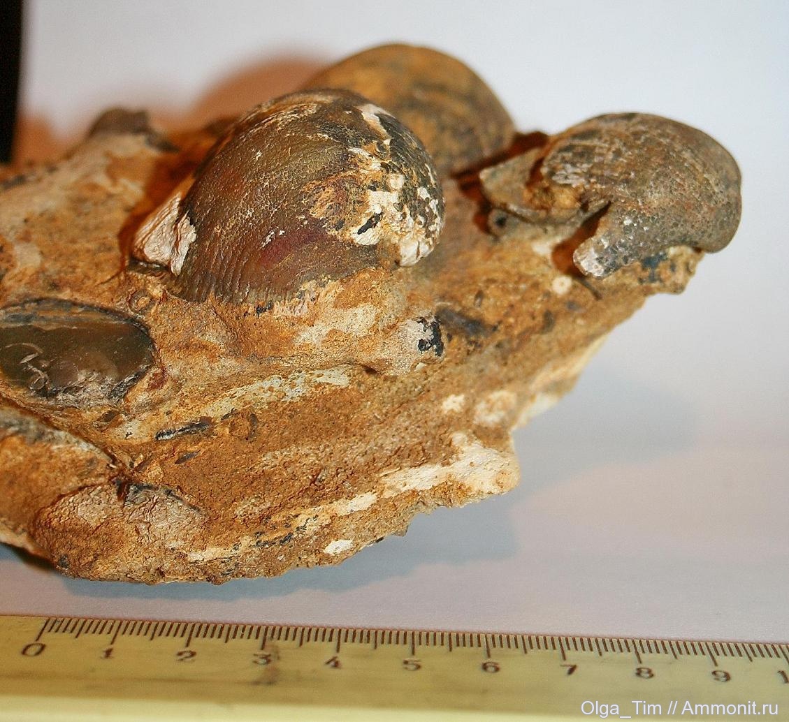 Подчистить здесь не получится, поскольку образец сильно окремнен. Судя по всему на фото типичные брахиоподы каширского горизонта - Admoskovia sp. (слева) и Choristites sp. cf. C. priscus (справа). | ||||||
