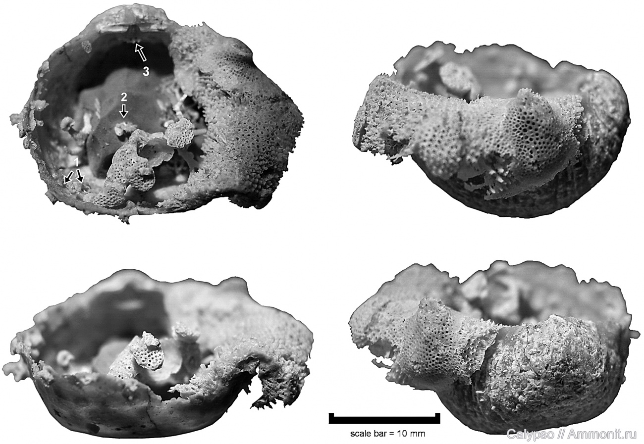 3 - симметрично закрепляющаяся в макушечной полости сетчатая колония мшанок полипоридного облика. Эта колония имеет длинные корневые выросты, с помощью которых она фиксировалась к субстрату. Подробнее с такими прикрепительными органами можно ознакомиться здесь.