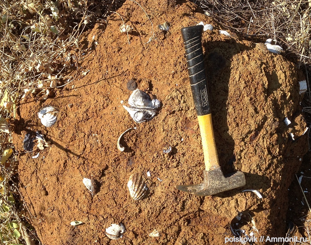 На поверхности выступают раковины Prosodacna (самый низ), вероятно, Lymnocardium squamulosum (ребристые раковины), Arcicardium (с килем, чуть выше центра) | ||||||