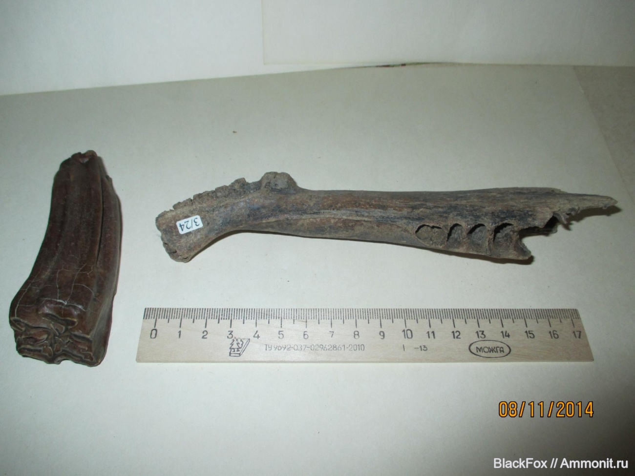 Зуб, и часть челюсти возможно тарпана Equus caballus. Найден в гравийном карьере, в куче мелкого гравия. Размер зуба 7 см. Старицкий гравийный карьер, дер. Переезд.