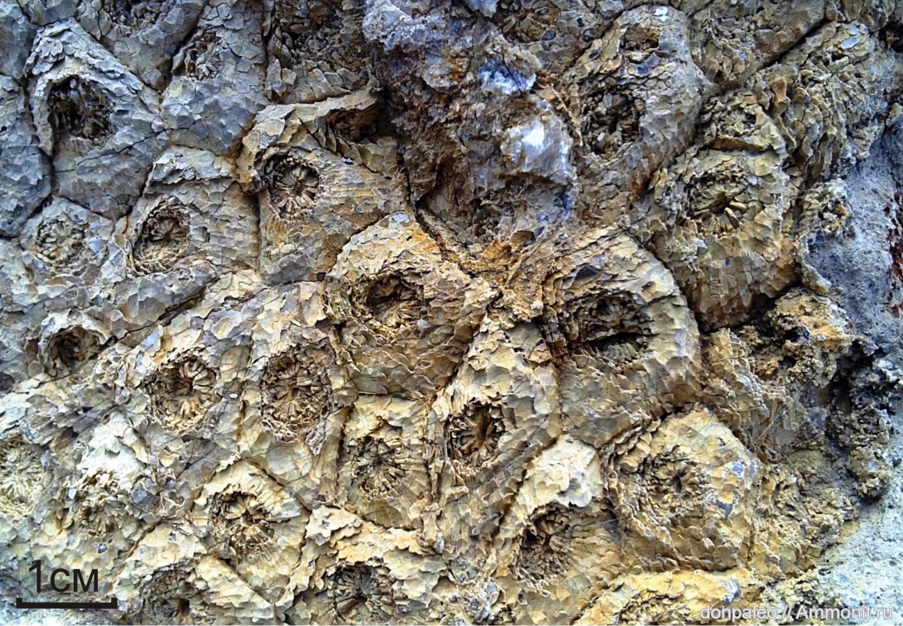 Верно, алмазная свита. Спасибо за идентификацию. В этом известняке обнаружил только одну колонию, в отличии от десятков колоний Petalaxis и губок Chaetetes. | ||||||