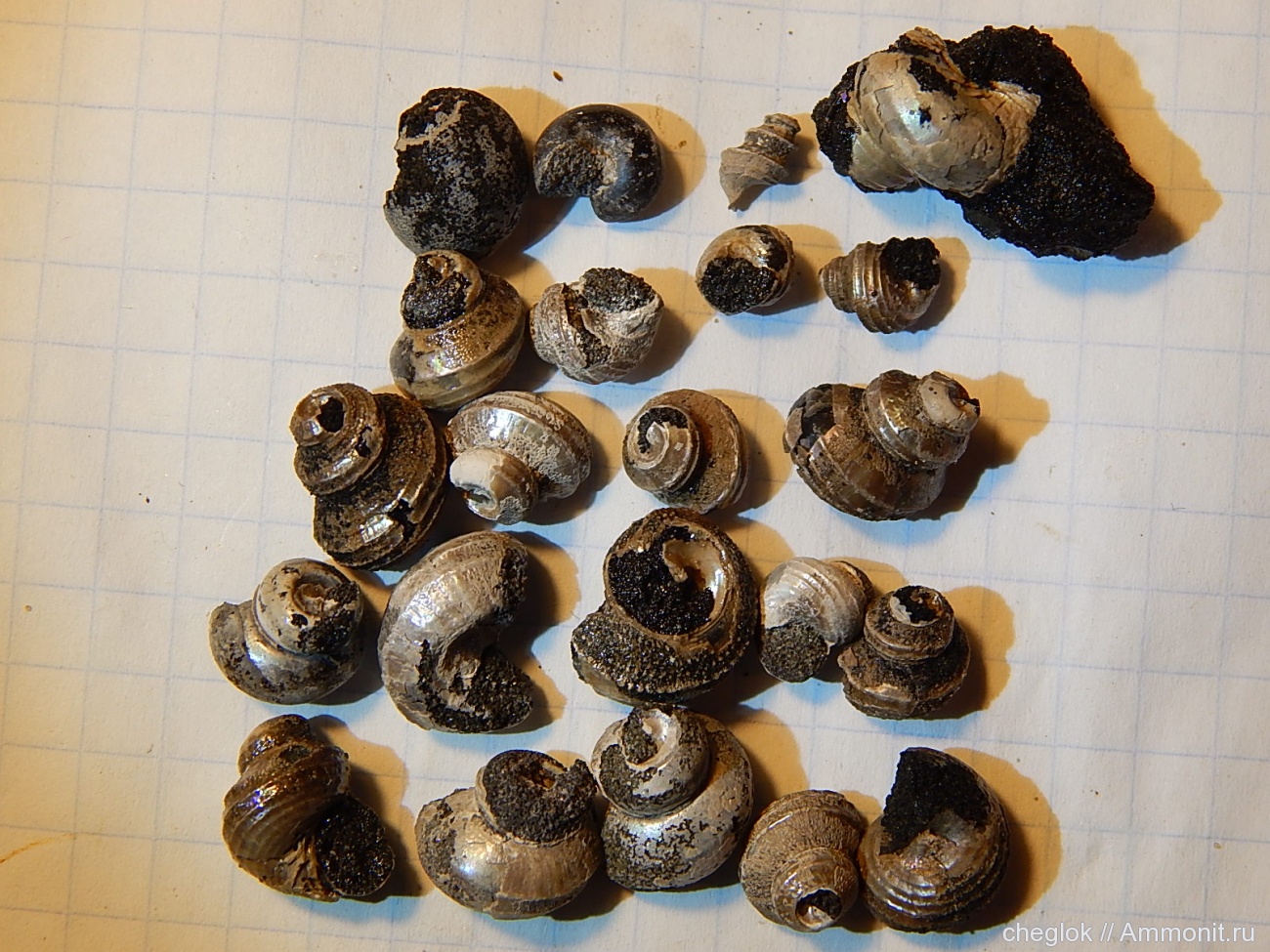 гастроподы, найденные в юрских глинах в Филёвском парке. В основном это эуциклусы, но похоже, есть и другие виды (верхний ряд).