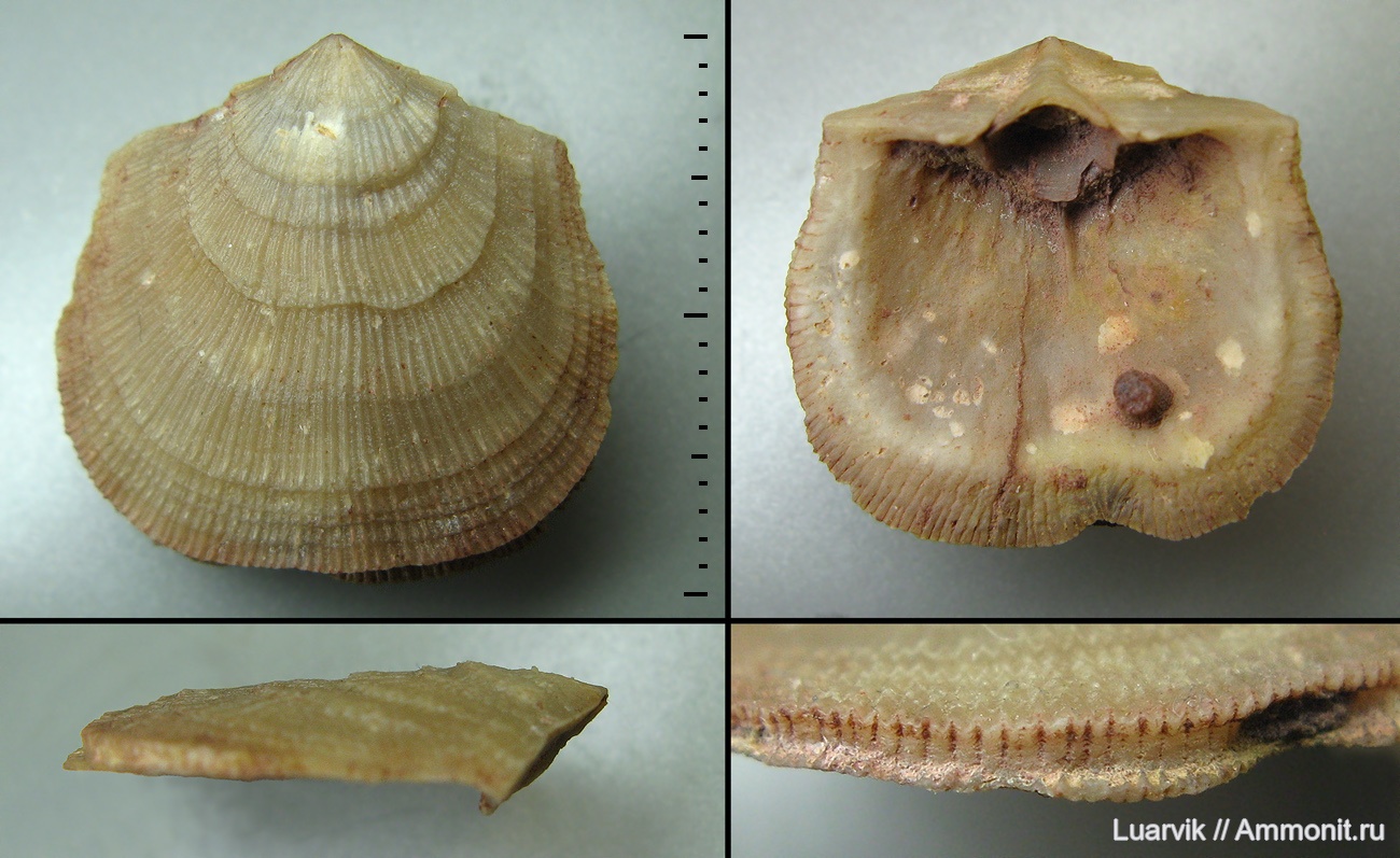 Изолированная спинная створка с залеченным повреждением на переднем крае и основанием мшанки, поселившейся после смерти брахиоподы, с внутренней стороны.