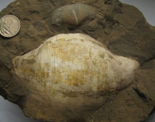 Gigantoproductus latissimus (Sow.), рядом - створка от какой-то спирифериды.