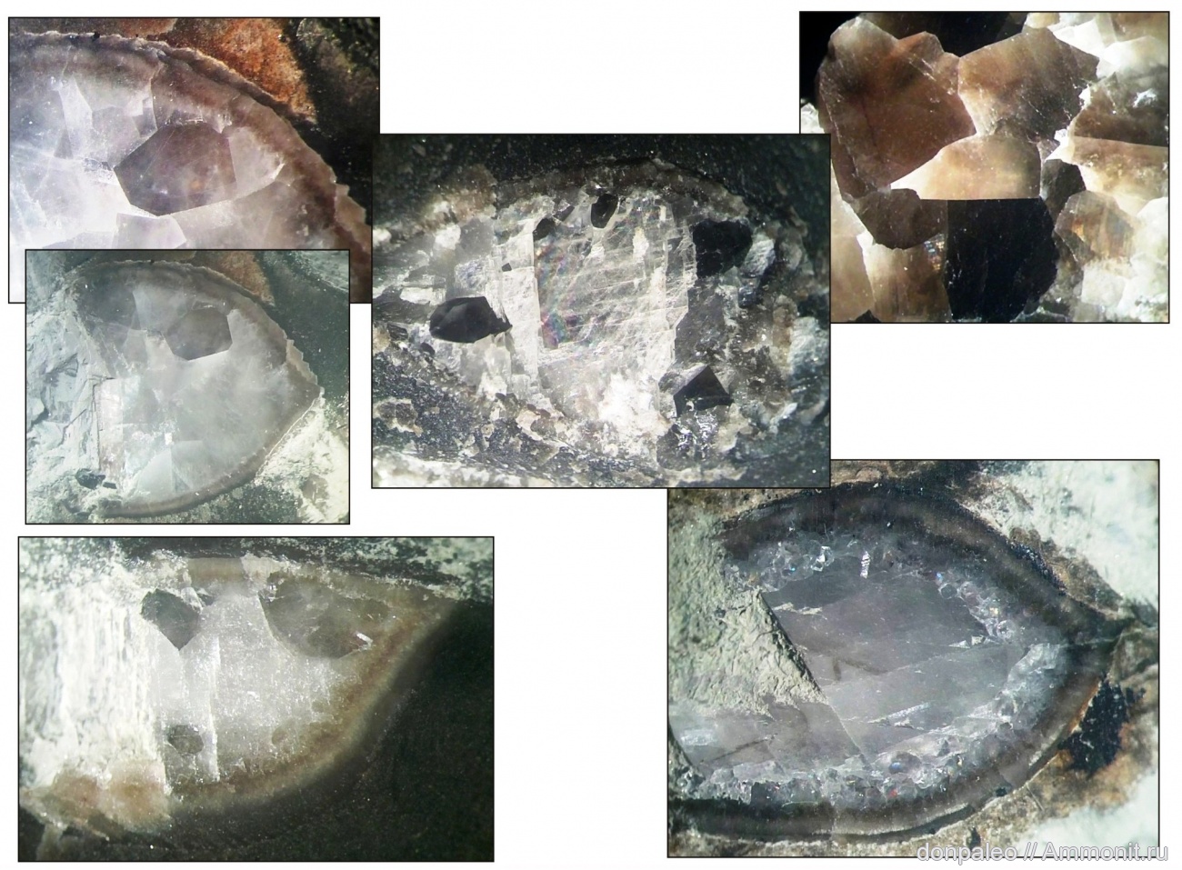 Помимо привычного замещения окаменелых остатков молочно-белым кальцитом, раковины брахиоподы Schizophoria resupinata замещаются хорошо-образованными кристаллами горного хрусталя и дымчатого кварца. Размер кристаллов до 2мм. Реже кристаллы кварца встречаются в виде скоплений, концентрирующиеся на внутренней части створок (фото внизу справа). Также наблюдается замещение раковин антраконитом (чёрная разновидность кальцита) (фото вверху справа). Брахиоподы известняка L7 (свита С2/6) пригород Зоринска (Луганская обл.).