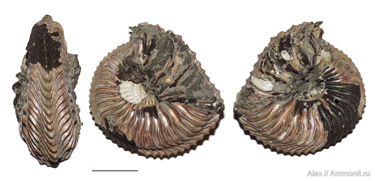 Этот не очень красивый, но интересный в палеоэкологическом плане Cardioceras попался в нижнем оксфорде Михайлова. С обеих сторон на его раковине видны двустворки-обрастатели (белого цвета). Двустворка крепящаяся в центральной части аммонита (на среднем фото) повторяет форму ребер аммонитовой раковины. Судя по смятой и как бы надвинутой на раковину жилой камере, аммонит располагался в породе вертикально и из-за этоо оказался деформирован еще на ранних этапах фоссилизации. При этом смятая жилая камера частично перекрывает раковину обрастателя.
