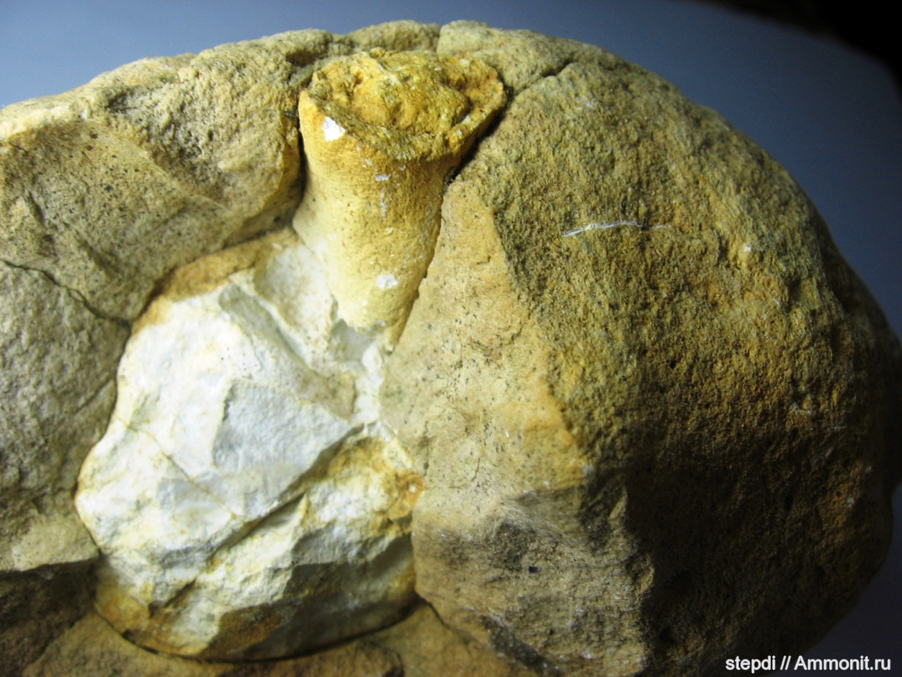 Какой-либо структуры на образце не видно: на сколе "камеры" просто однородный материал, а поверхность "стебля" - гладкая. В принципе можно попытаться всю эту конструкцию извлечь: вмещающая порода имеет множество трещин, расходящихся от "стебля". Тогда будет по крайней мере видна форма "камеры".
