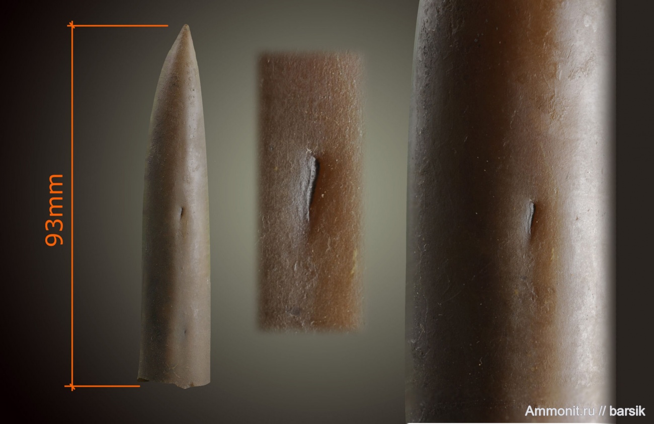 Образец, полученный от уважаемого Митта В.В. Юрский ростр довольно крупного белемнита с двумя прижизненными повреждениями. На боковой стороне хорошо видно два укуса, имеющих вытянутую треугольную форму. Скорее всего, это следы зубов небольшой акулы. Повреждение явно прижизненное, потому что при боковом освещении хорошо видно, что места укусов уже «заплыли» и подзатянулись. Белемнит продолжал расти и участки со следами зубов немного прогрузились в глубину. Образовались пологие выемки на ровной поверхности ростра.