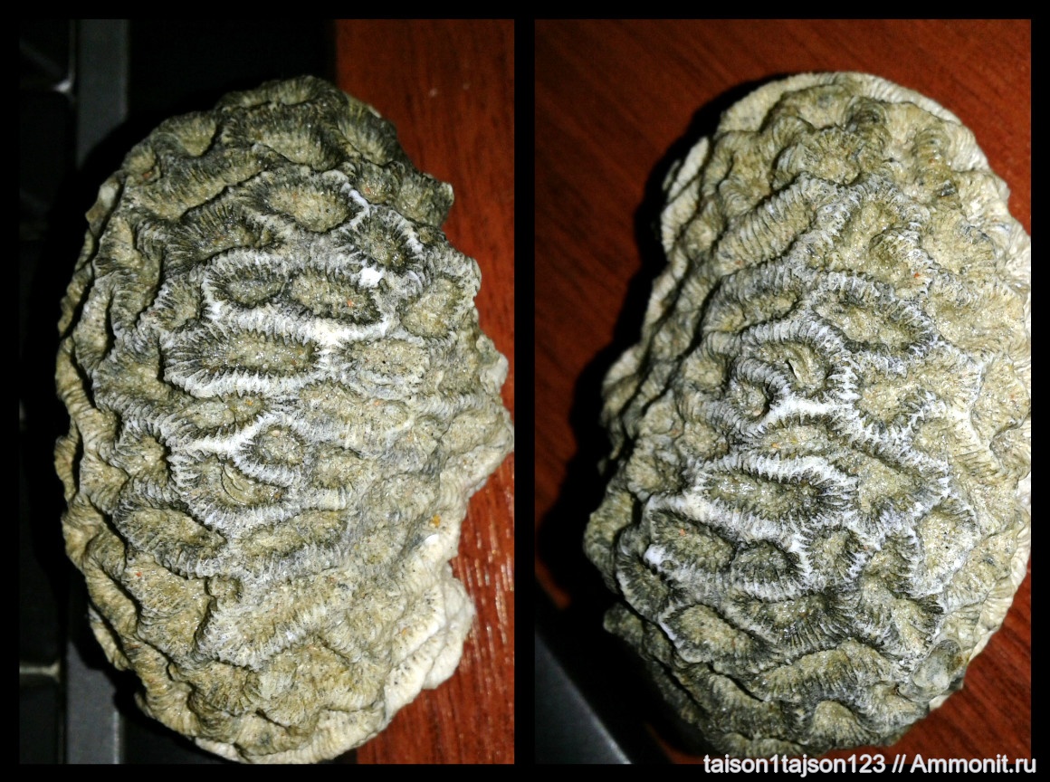 Место находки нужно исправить.Убрать Архангельская область.Мозговиками дайверы обычно называют меандроидные формы склерактиний.Здесь центральные части кораллитов растворились,поэтому идентифицировать его до рода невозможно. | ||||||