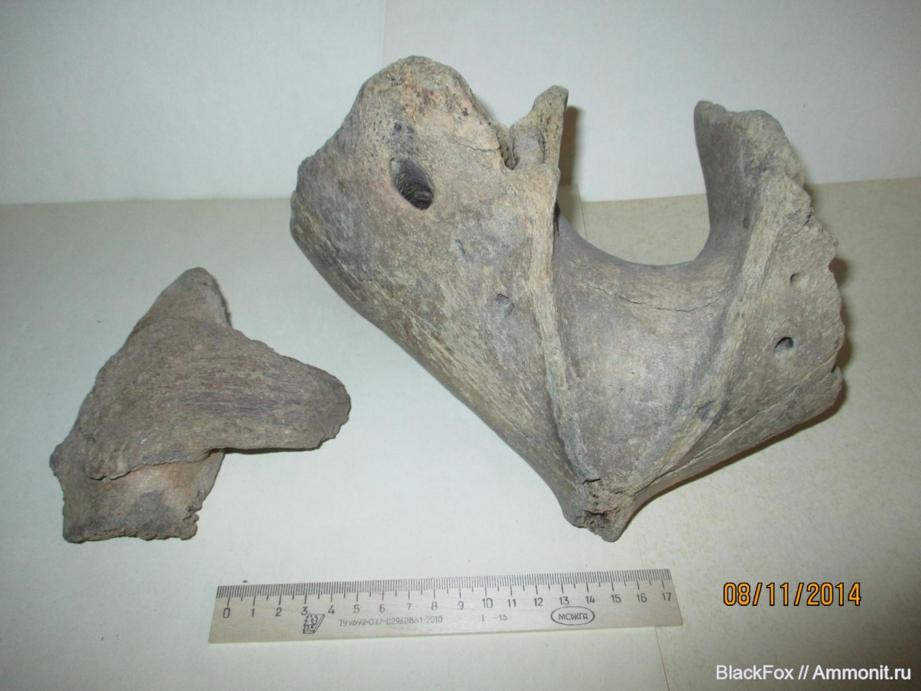 Фрагмент черепа овцебыка (Ovibos moschatus) и фрагмент нижней челюсти молодого мамонта (Mammuthus primigenius).