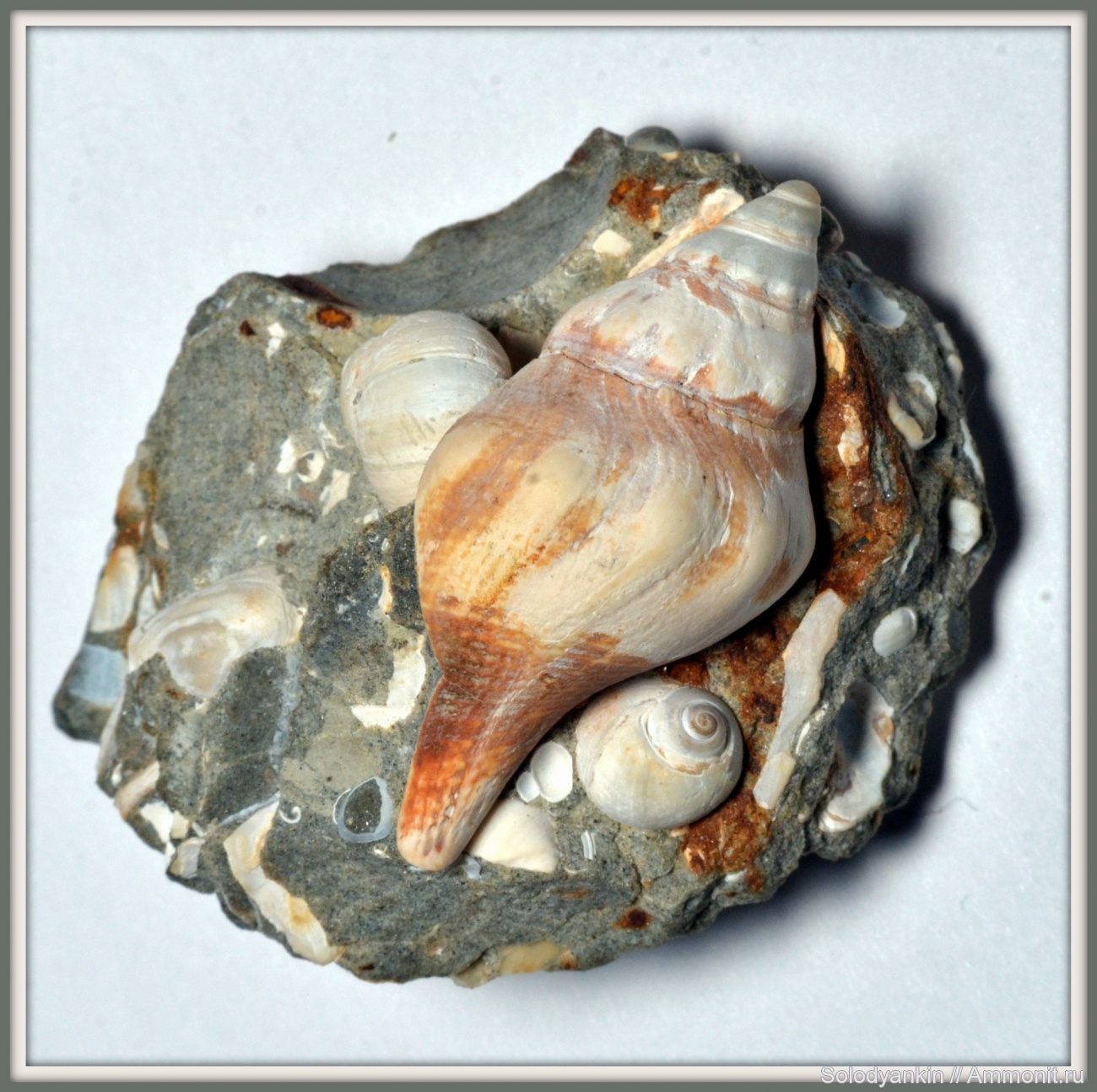 К центральной раковине гастроподы (высота 3,9 см) присоединились с двух сторон небольшие соседи (Natica?).