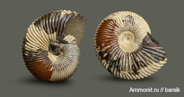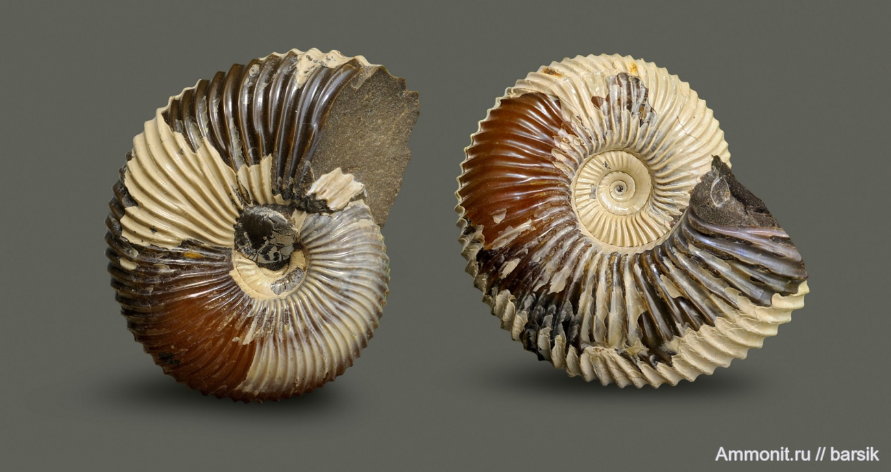 Слева – проекция с прижизненным обрастанием. Двустворка устроилась почти по центру пупка и взрослела вместе с ростом раковины аммонита. И если вентральная сторона сумела сохранить общие очертания контура раковины. то умбональная стенка на жилой камере ближе к устью вместо раскручивающейся спирали, согнулась почти под прямым углом и приняла уродливую форму.
