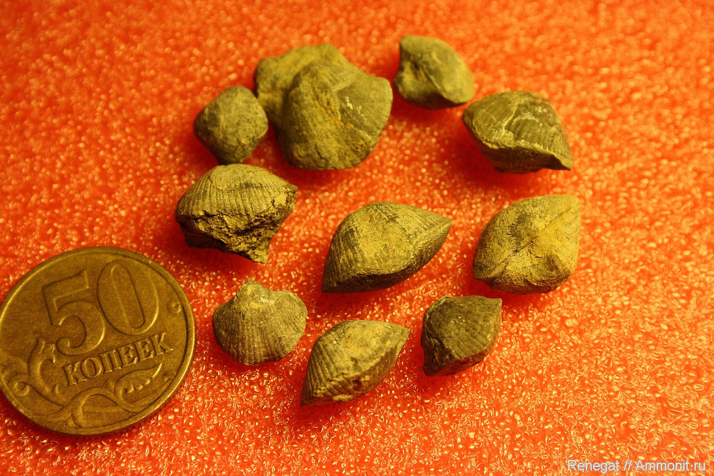 Привёз из поездки непонятный образец, с большой выпуклостью в центре образца и маленьким обрамлением из ракушек, при ближайшем рассмотрении и расчистке оказалось "псевдофоссилией" (ложным ископаемым), а если быть ещё точнее округлым стяжением в глинистой породе. Но в награду осталась эта горстка маленьких брахиопод, решил не обижать малюток и запечатлел их.