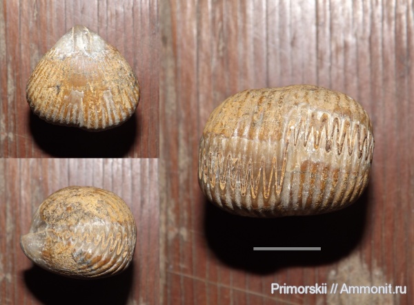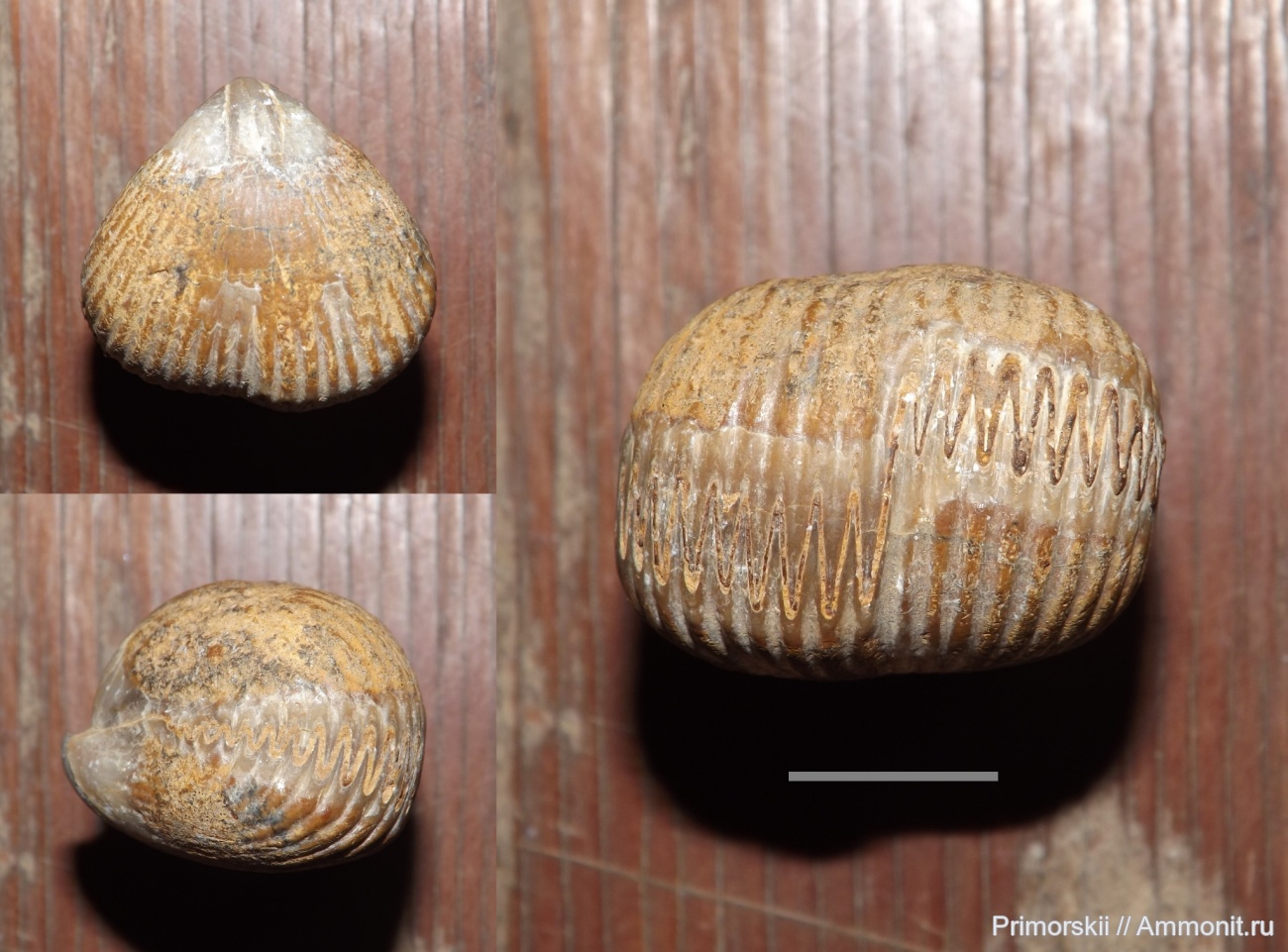 Приобрёл три брахиоподы на ebay, случайно затесавшиеся у китайского продавца безделушками. Никакой информации, кроме как "натуральные ракушки" :), и то, что они родом из Мадагаскара, он не дал. Заинтересовали своим искажением формы по оси, причём есть смещение как по одной стороне, так и по другой фото. На этом сайте нашёл одну похожую Брахиопода Rhynchonellida , но без точного определения.