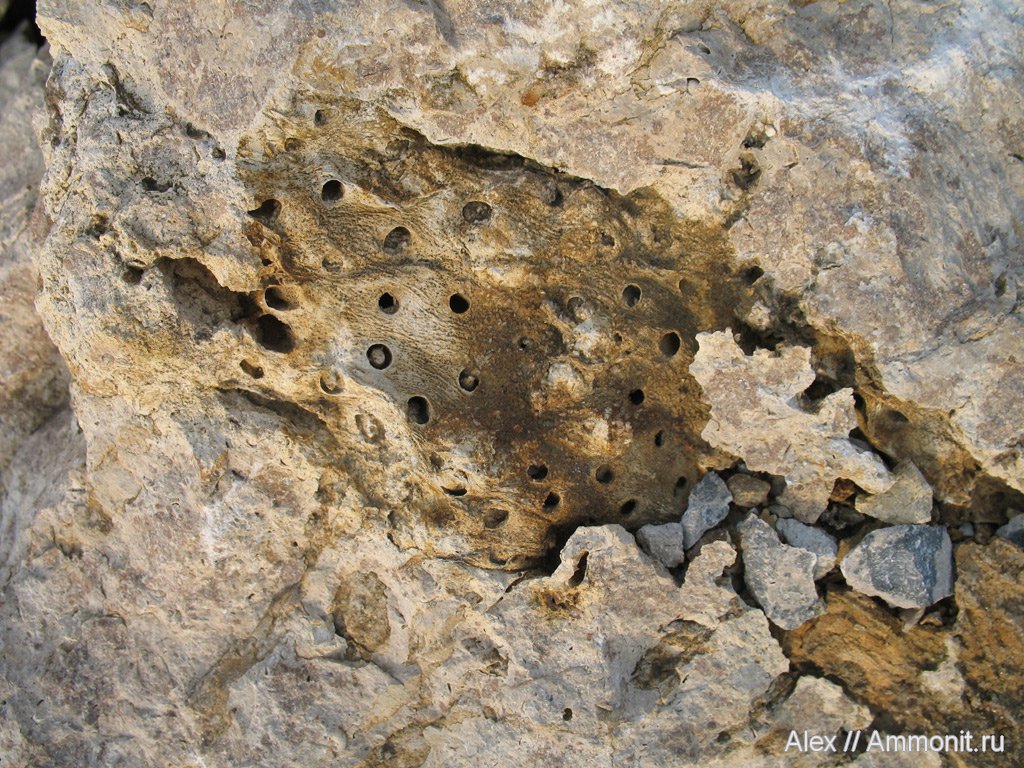 Фрагмент стигмарии в известняке нижнего карбона. Калужская область, фото сделано в 2008 году.