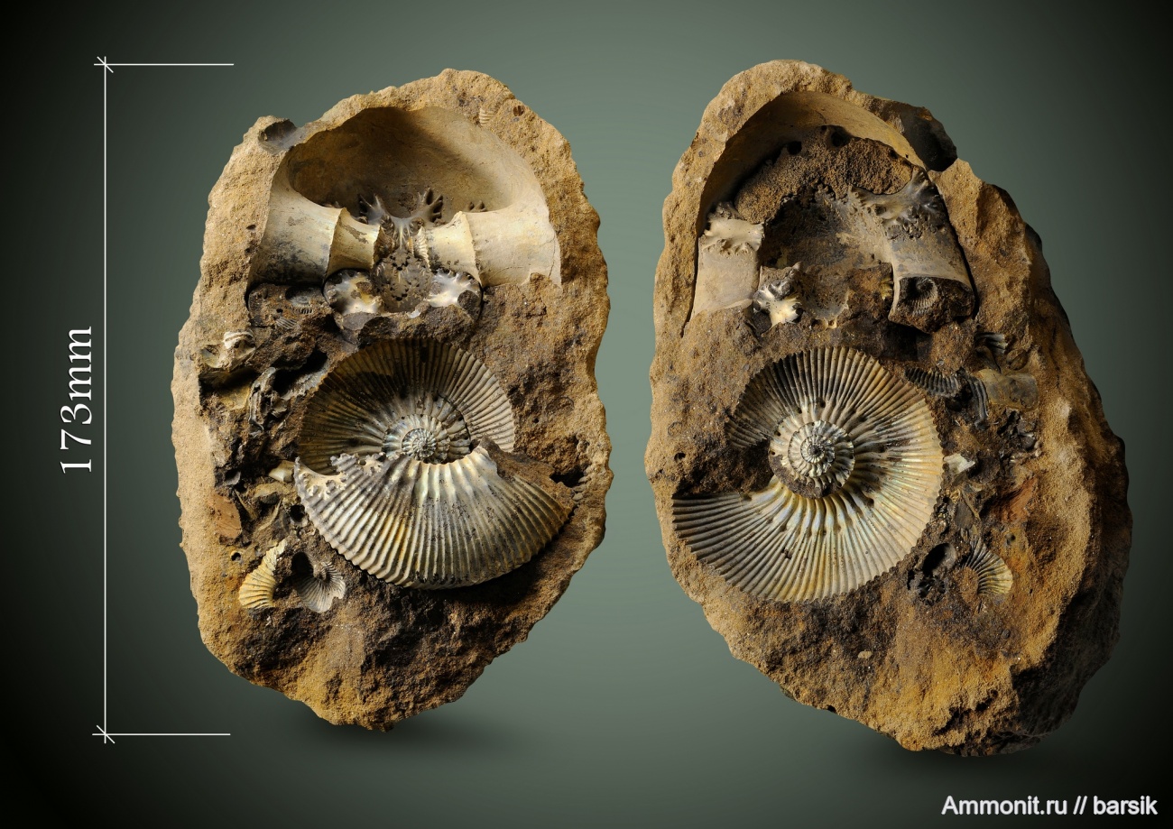 Необычное сохранение крупного Rondiceras sokolovi, которое показывает элементы строения раковины. На дополнительном снимке хорошо видно строение узкого и отвесного пупка в виде негативного слепка.