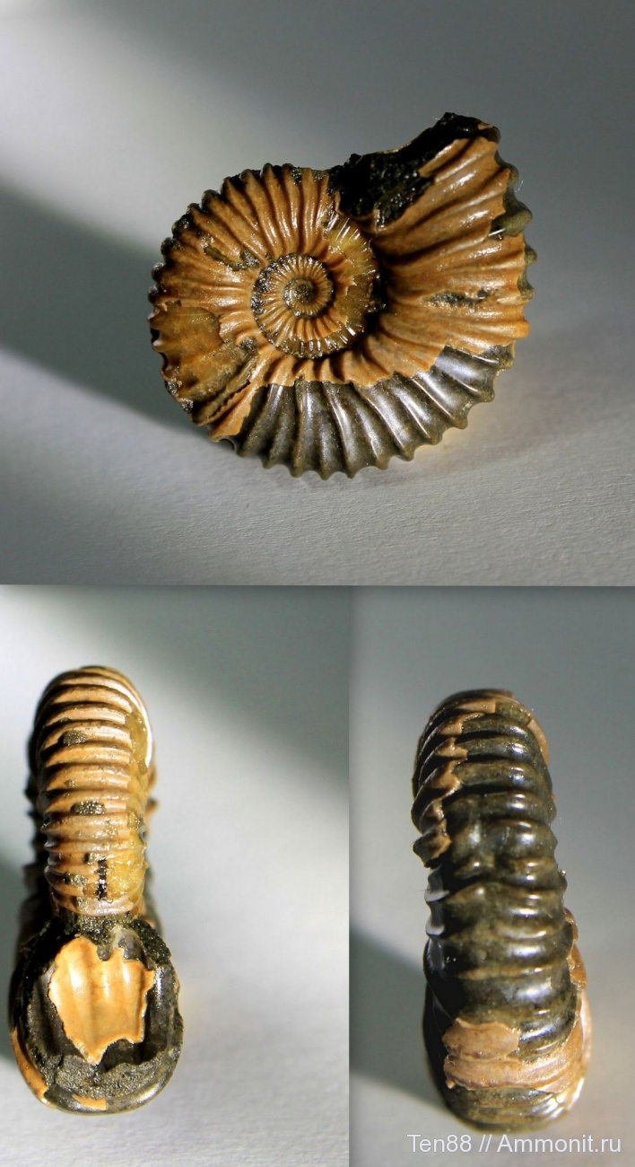 Вот такой аммонитик (3,2 см.) попался. Видно (3 фото), что у него было прижизненное повреждение, которое потом зарубцевалось и ребрышки стали расти правильно :)