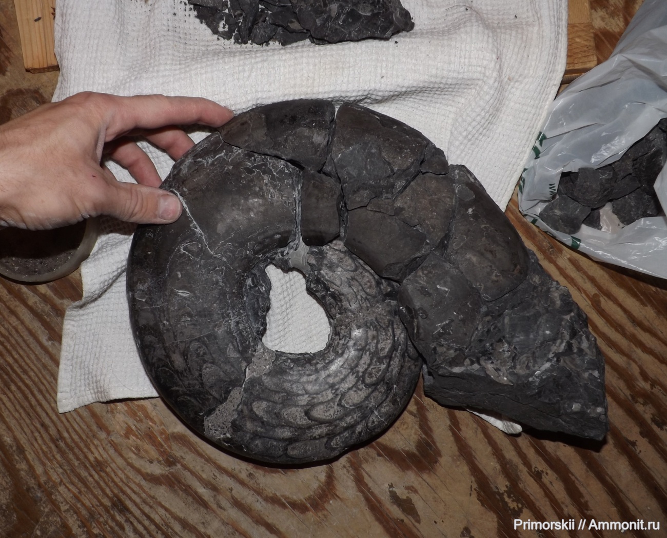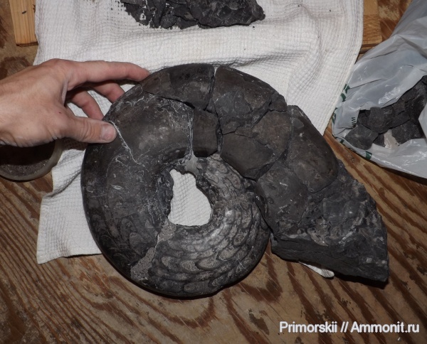 Это самая большая аммониидея(около 25см) из прошлогоднего сбора, Churkites syaskoi Zakharov and Shigeta, и пока единственная в моей коллекции. При её расчистке, выяснилось что давление пород поработало над ней "на славу". Я конечно знал, что она разбита, но не до такой степени, и т.к. работы здесь предстоит больше чем я рассчитывал, и готовый вариант будет явно не скоро, выставляю пока так. Хоть жилая камера и разбита, видно что она полная - сохранился отпечаток устья.