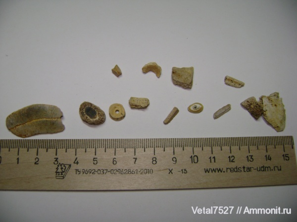 Зубные пластины скатов - милиобатидов, позвонки рыб, плоские кости наверное обломки панцирей черепах, и, как уже было сказано, желудочная пластина морского слизня. | ||||||