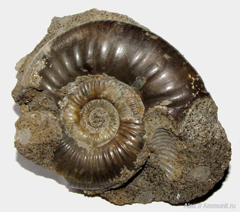 Аммонит Indosphinctes с частично сохранившейся раковиной и устьем. Диаметр 63 мм. Сохранилось бы и ушко, но под ним оказалась маленькая раковина другого аммонита, которая при извлечении отлетела, унеся с собой часть ушка этого индосфинктеса.