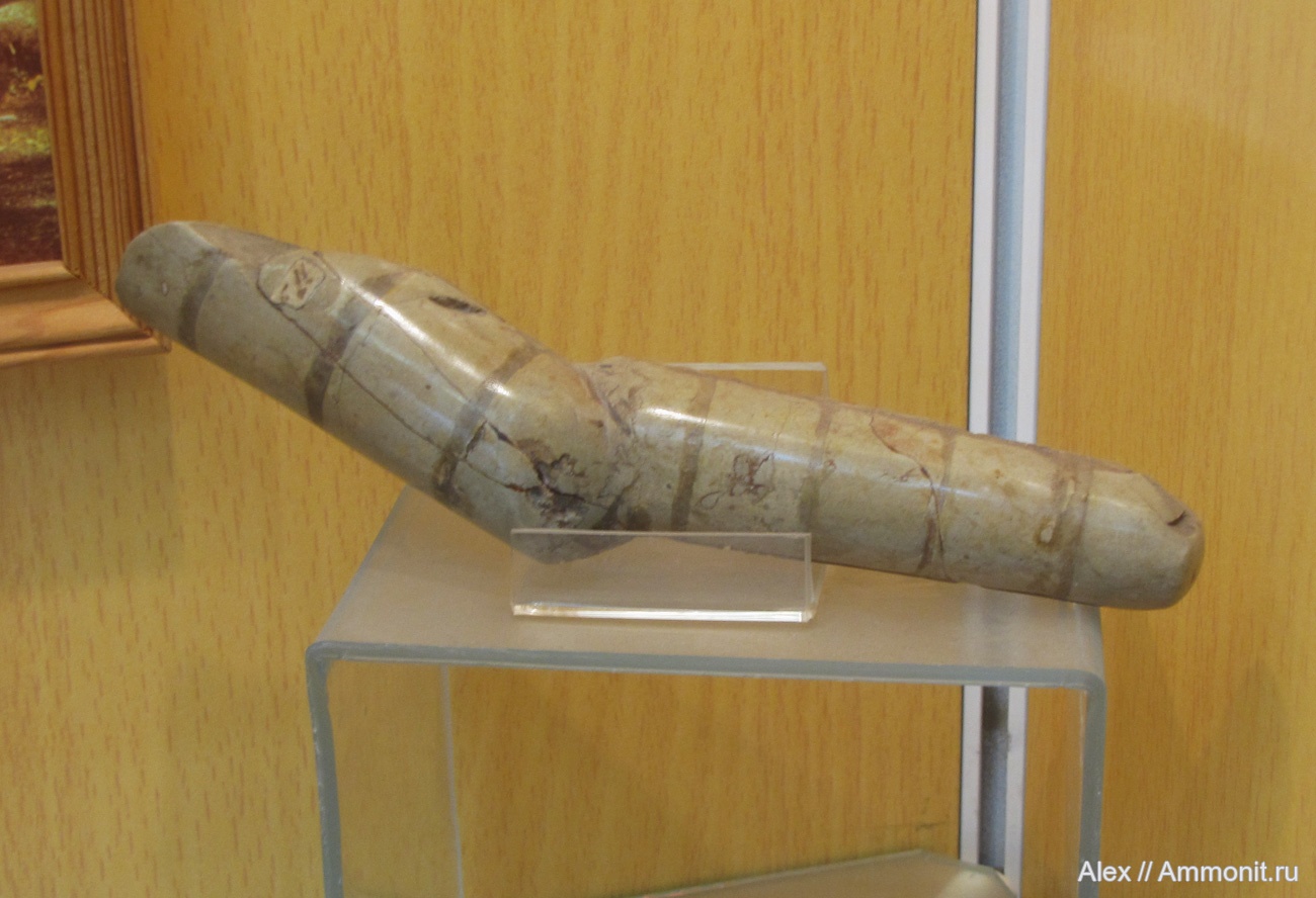В общем образец загадочный. Единственное предположение которое у меня пока возникло - что это не Orthocerida, а Aulacocerida из подкласса колеоидей. Возраст подходит (триас), а они вполне могли залечить перелом фрагмокона, так как имели внешнюю мантию поверх раковины. К сожалению я не догадался подобраться в образцу сбоку и сфотографировать сифон (у ортоцерид он центральный, у аулакоцерид краевой), но при следующем посещении музея постараюсь это сделать и расскажу здесь о результатах.
