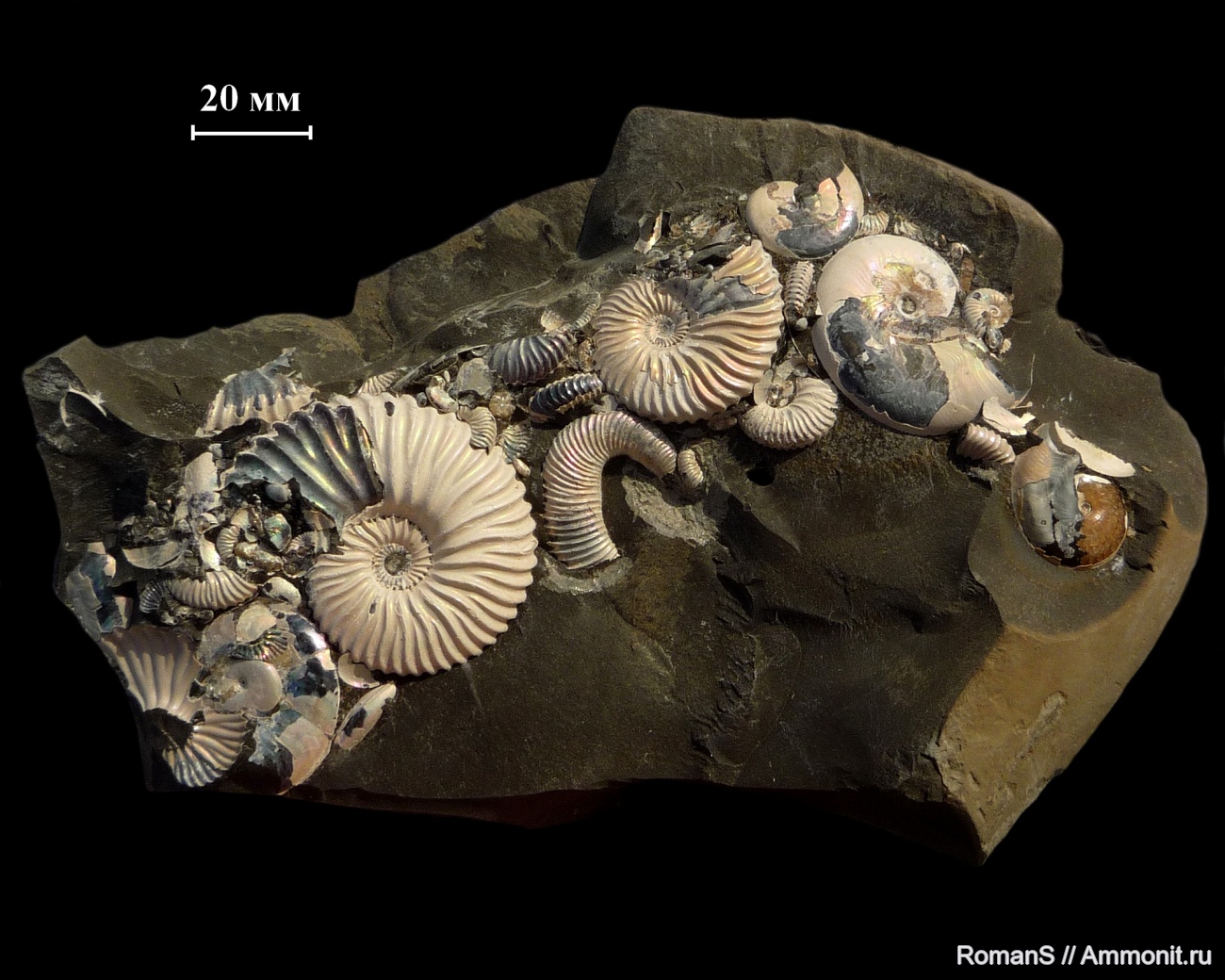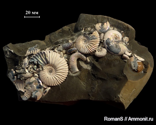 Спасибо, Алексей! Честно говоря, я не лукавил, когда написал, что это удачный раскол.При первом ударе, открылась небольшая часть аммонитов слева, решил их приоткрыть и вторым ударом молотка "было мне счастье", даже глазам своим не поверил, оставалось только обколоть аккуратно лишнюю породу.Дома пытался приоткрыть крупного гетероморфа, надеялся, что он в породу ныряет. Aconeceras с целой жилой камерой и устьем, есть у них на устье небольшие выросты, не знаю, можно ли их называть ушком в нашем понимании, как например у сутнерий. | ||||||