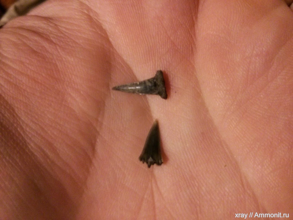 Вот такие замечательные зубки попались в Филях при промывке глины зоны nikitini, жаль второй зубик без корня. Размер зубиков примерно 1 см.