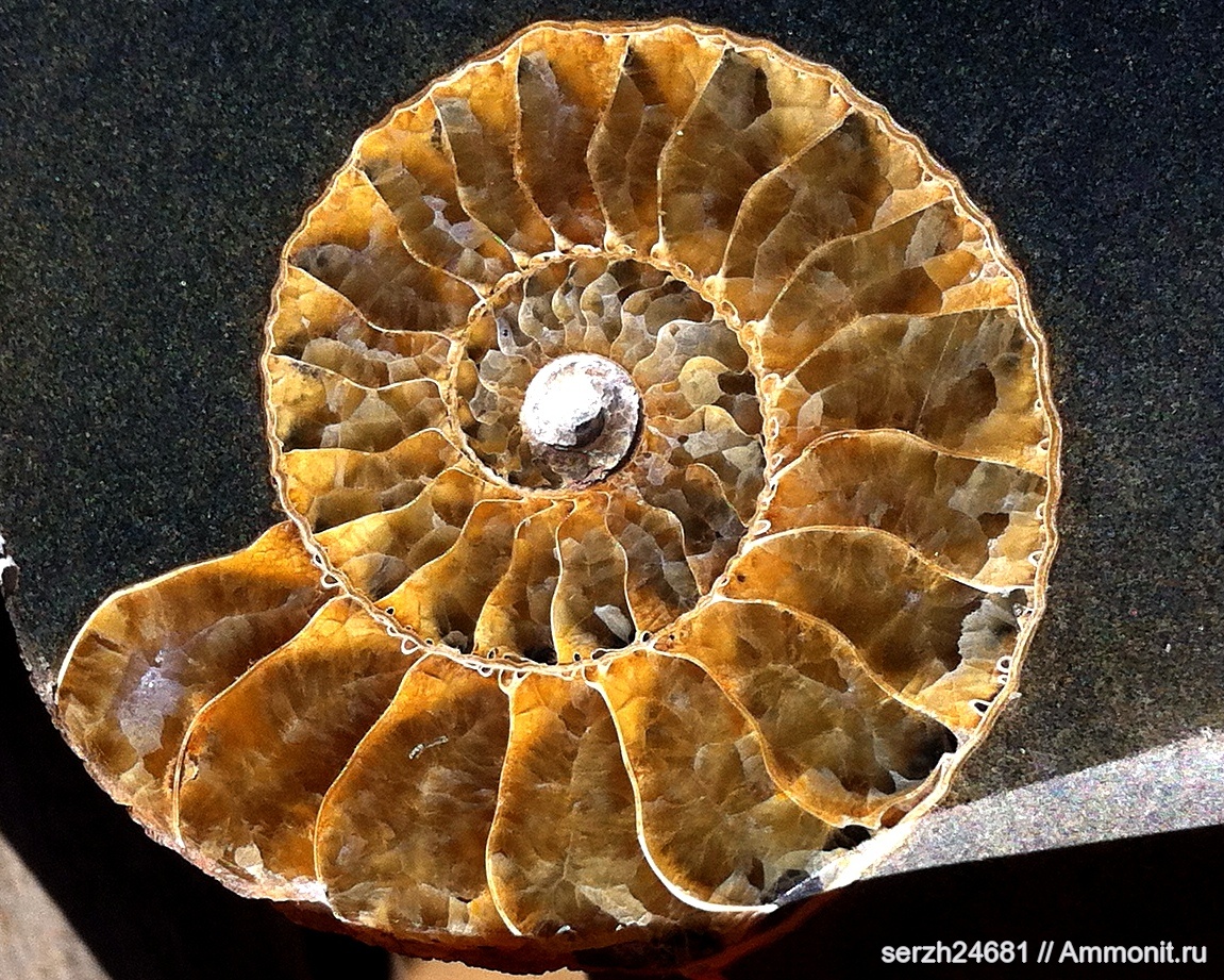 Образец найден на р. Курджипс в конкреции из меловых отложений.D4см.Получился вид перегородок с 3D эффектом при солнечном свете.