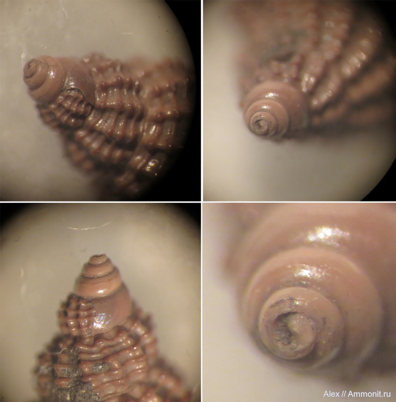 Хотя у нас на сайте уже есть начальные стадии гастропод Maturifusus conspiquus на фото сделанных при помощи электронного микроскопа, здесь я хочу показать как они выглядят под бинокуляром. Целиком эти раковины показаны на фото Стайка Maturifusus.