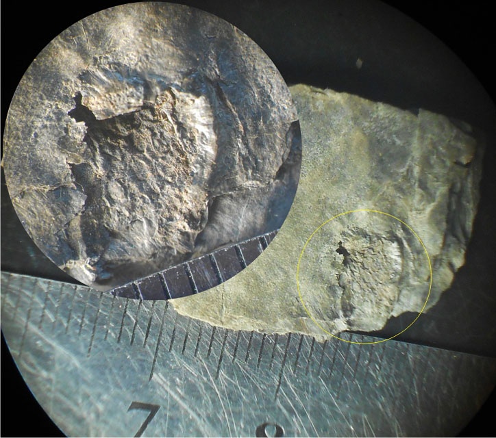 Нашел большой образец в отпечатками коры. Поскольку особенности морфологии очень мелкие, показываю фрагмент под микроскопом. Это третья точка в Донецке, где были обнаружены отпечатки с ботродендроном. В прежних находках пласт был h1, по последней - уточняю.