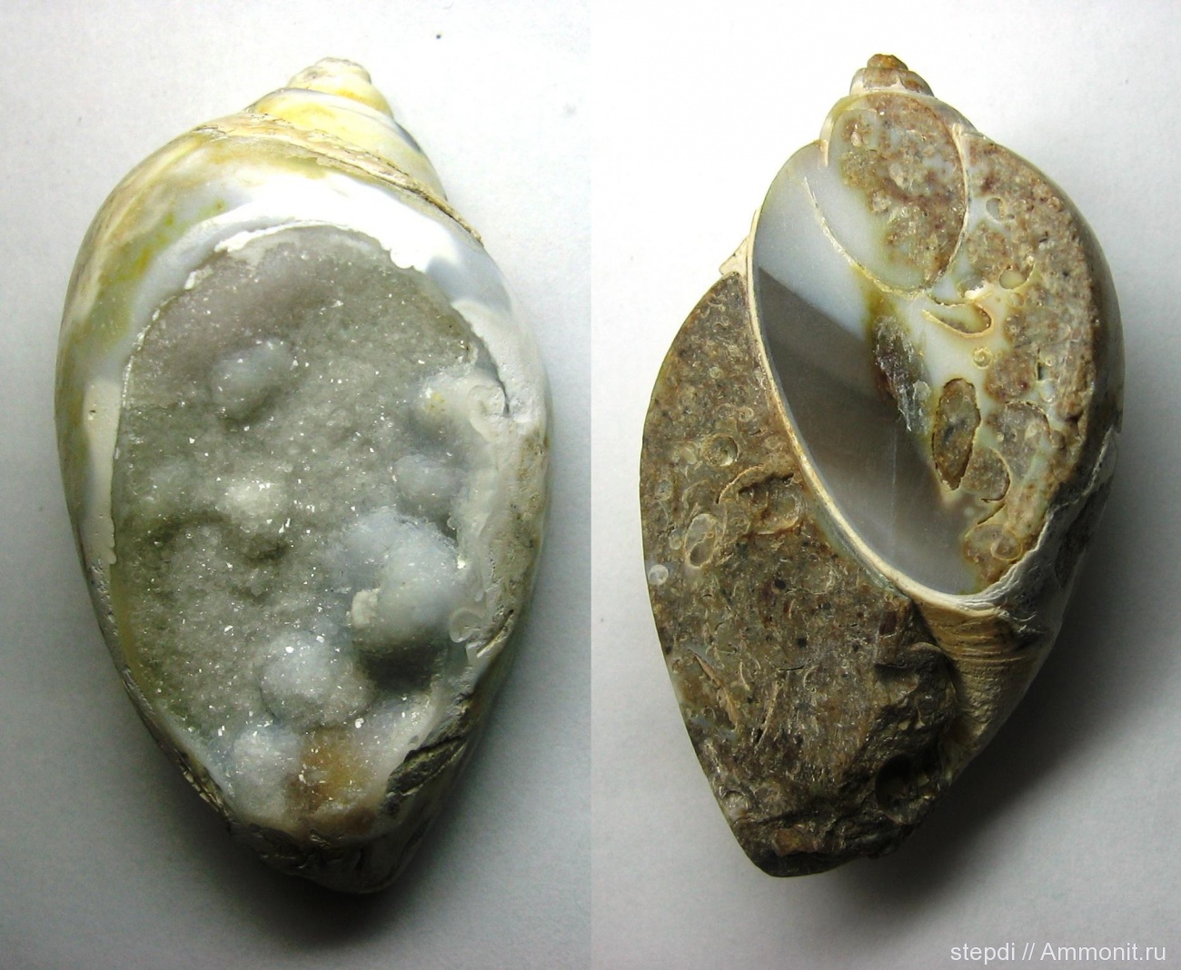 Внутреннее ядро синистральной (левозакрученной) раковины гастроподы Platyphysa princepi. Место находки: река Кен, Декканское плато, штат Мадхья-Прадеш, Индия. Возраст около 65 млн. лет, то есть можно отнести к верхнемеловому периоду. Замещение халцедоном и кварцем. К сожалению, эти ядра обычно распиливаются и шлифуются для использования в ювелирных украшениях. Длина около 45 мм.