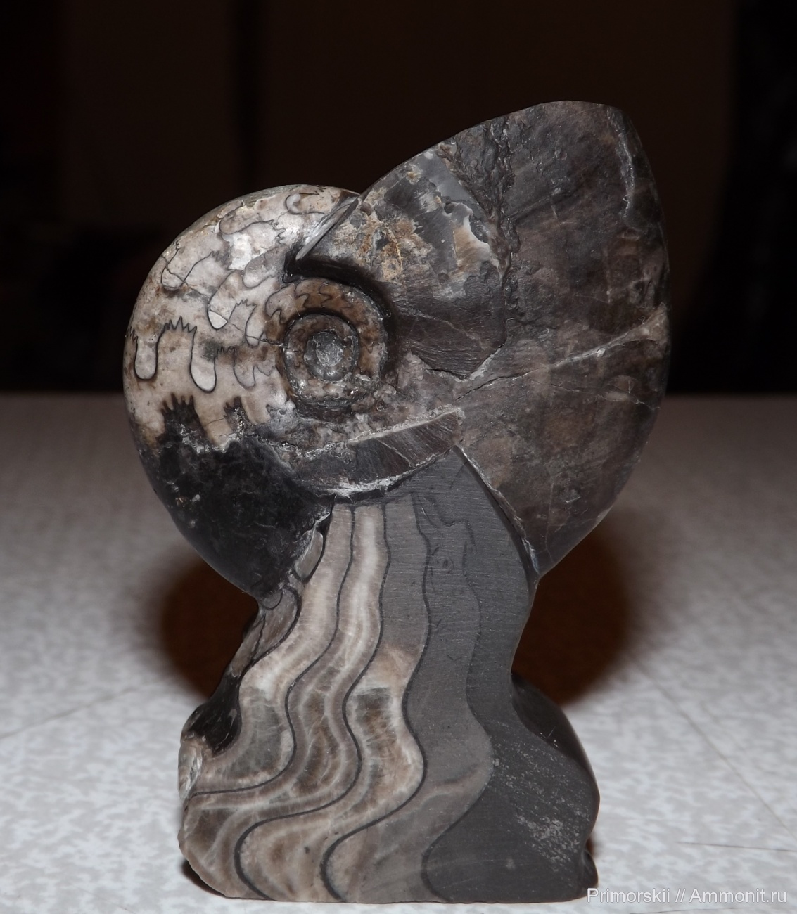 Эта аммоноидея, так же, как и эта , была найдена уже без части фрагмокона: фото. В данном случае пришёл к такому решению. Часть фрагмокона со внешнего оборота на границе с жилой камерой оставил в виде подставки.