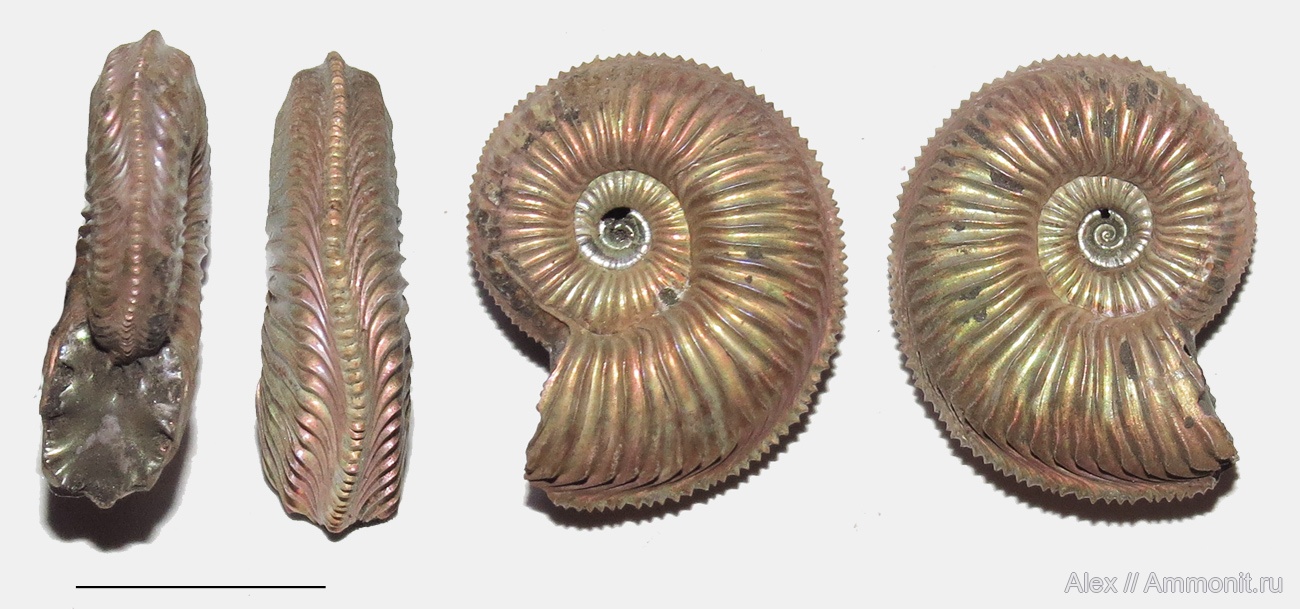 Маленький, но сильно искривленный Amoeboceras alternoides. Возможно, что у него под оборотом сидит небольшой обрастатель (какая-нибудь мелкая двустворка), который и стал причиной искривления этой раковины. Длина масштабного отрезка 1 см.
