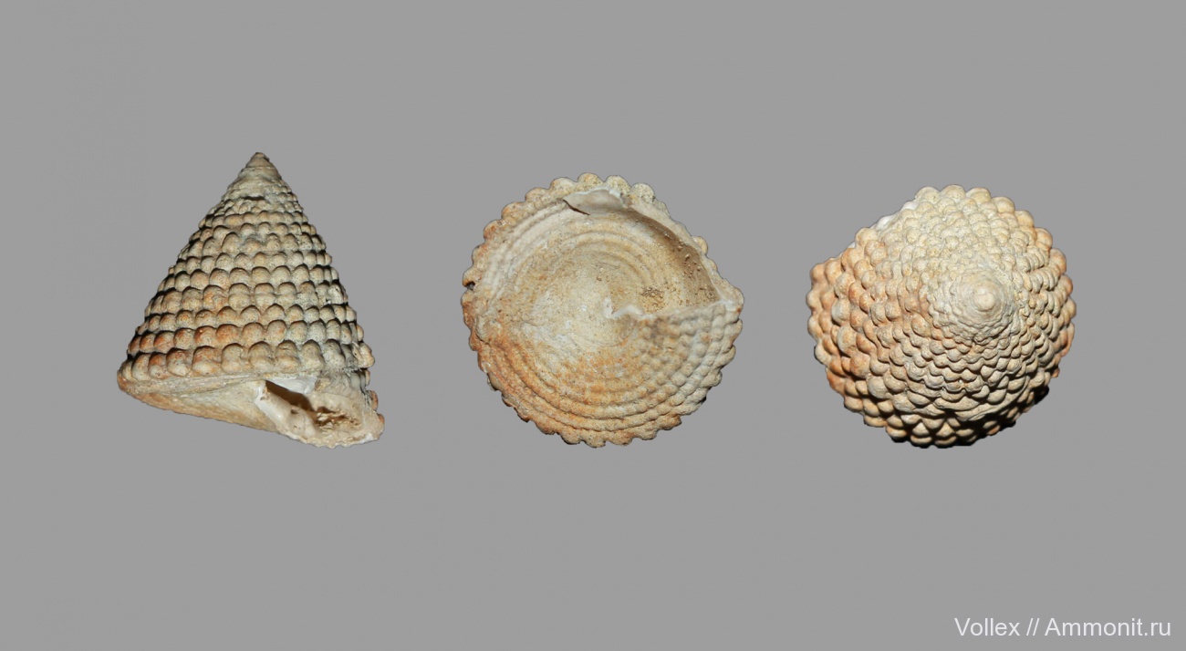 Как я понимаю, на обороте три ряда бугорков, а у Trochus lucasianus в Brongniart, 1823 (работа, где он выделен) - два ряда бугорков, поэтому тут другой вид. Другой близкий вид, T. margaritaceus (Lamarck), если судить по атласу Косманна и Пиcсаро по эоценовой фауне Парижского бассейна, отличается более тонкой и частой скульптурой. Так что так... | ||||||