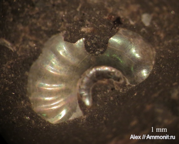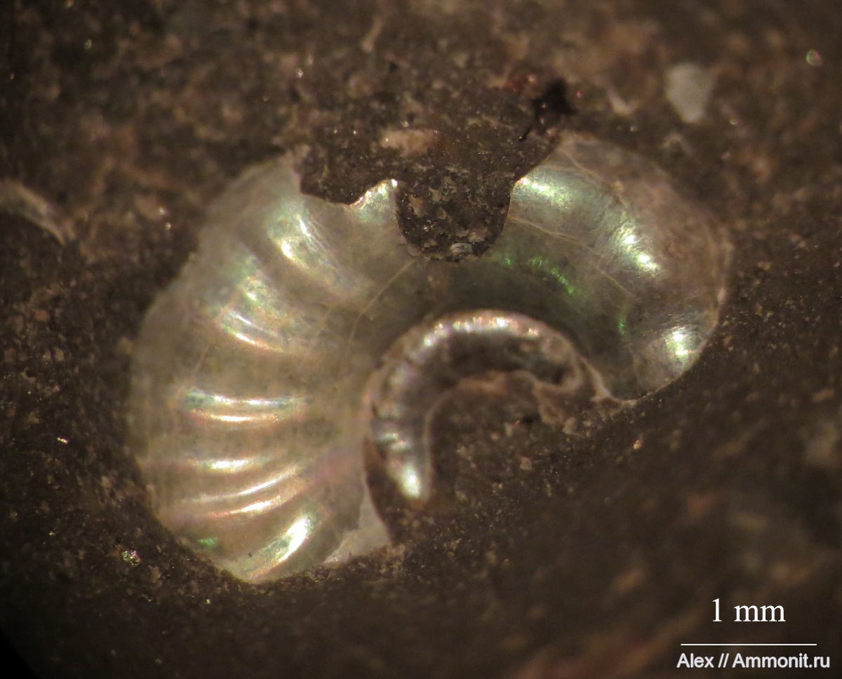 На крошечной раковинке аммонита Deshayesites виден типичный вентральный укус, похожий на укусы, которые можно найти на значительно более крупных аммонитах (например Покусанные Kachpurites fulgens, Очень интересный Kachpurites). Это значит, что хищники, кусавшие аммонитов за заднюю часть жилой камеры, начинали охотиться на своих жертв с раннего детства. Видимо, они росли вместе с аммонитами, постепенно переходя к охоте на все более и более крупную добычу.